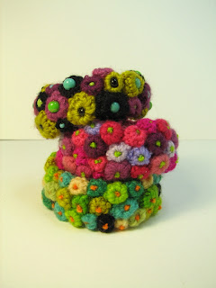 En las pulseras de la siguiente foto, los cierres los he hecho a base de botones de colores sujetos con cintas elásticas.