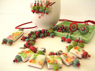 Previamente hice con arcilla polimérica de los colores rojo, turquesa y jade un montón de bolitas.
