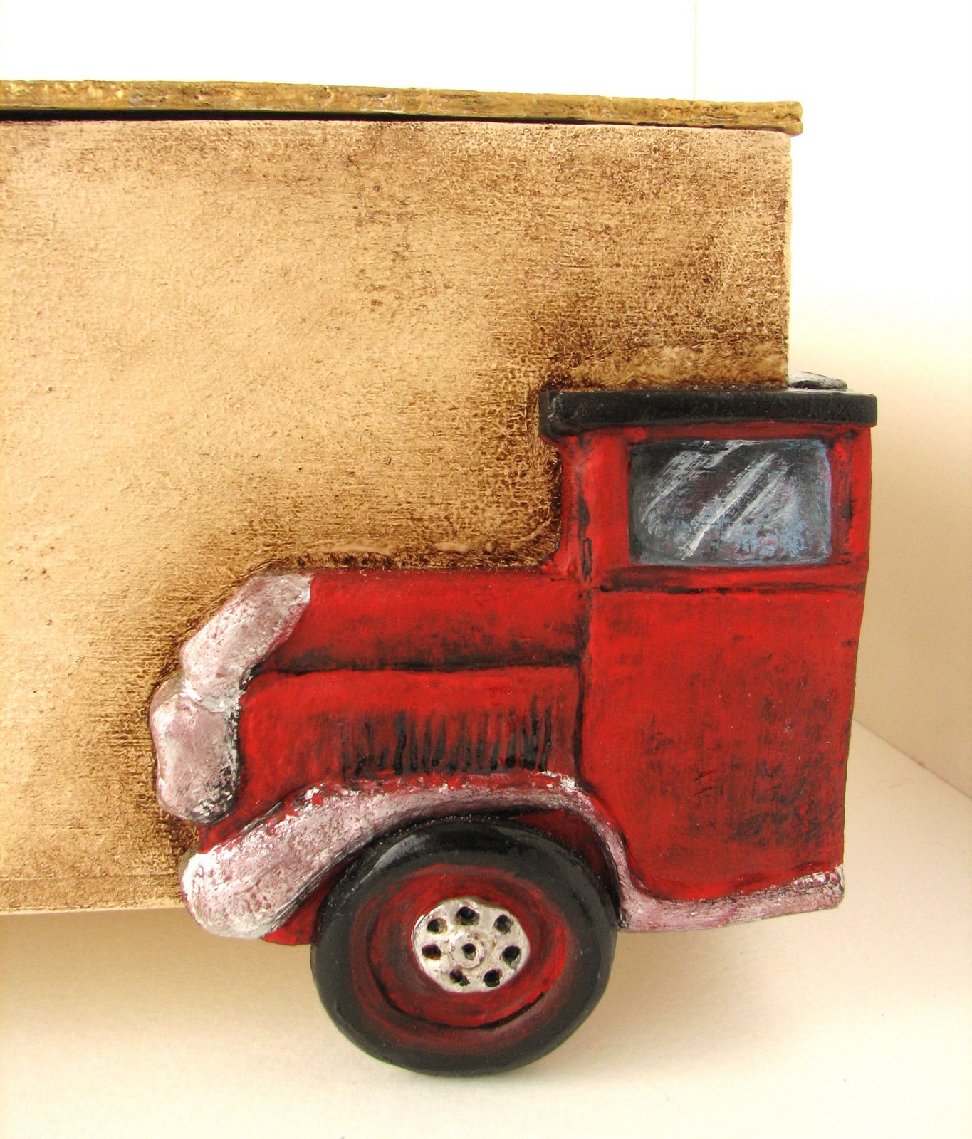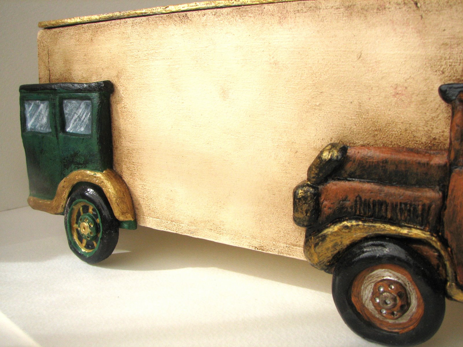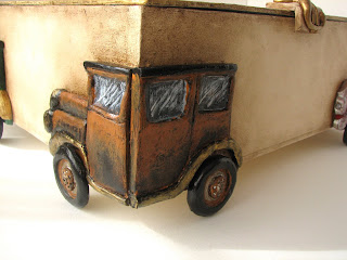 En las cuatro esquinas a modo de "patas" se decoran con automóviles de la época, hechos de arcilla polimérica y pintados.