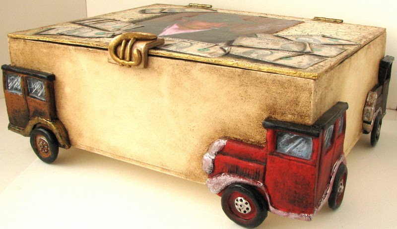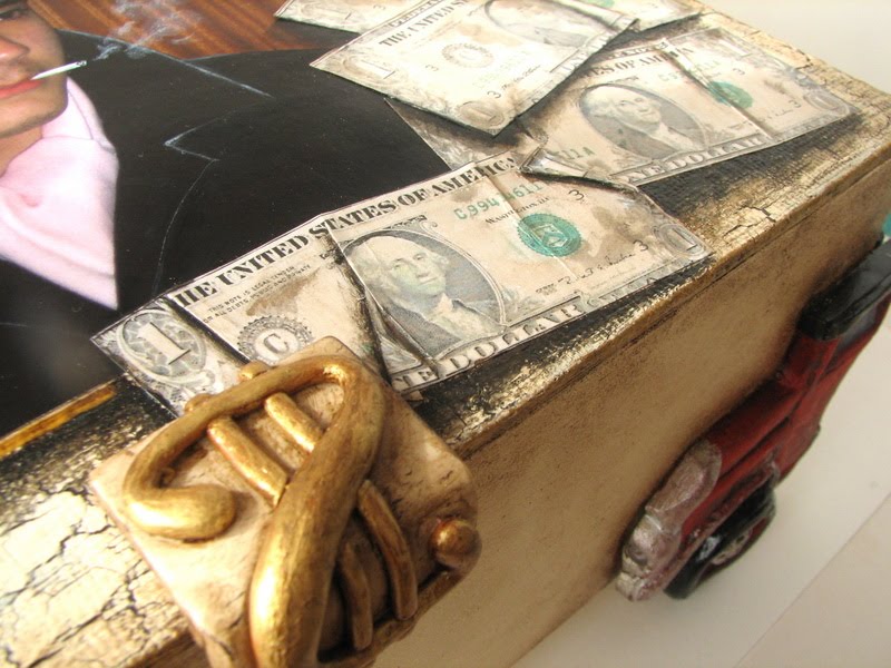 Los dólares son fotocopias pegadas de forma arrugadas y luego pintadas para dar sombra con pintura también acrílica. El símbolo del dolar que cierra la caja es arcilla polimérica.