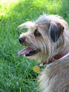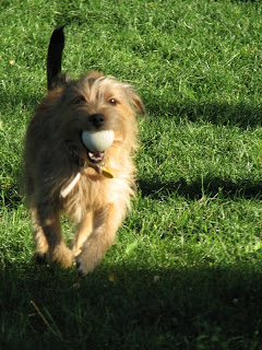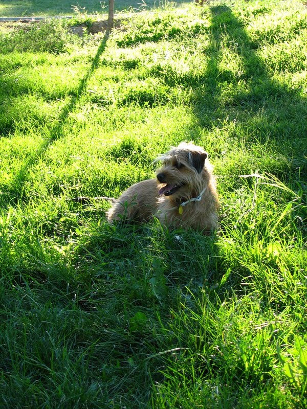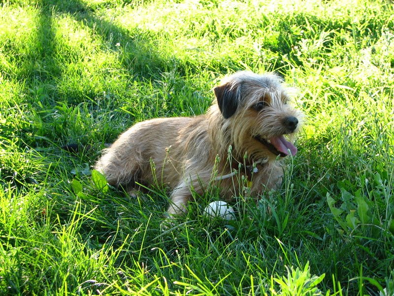 Después de correr todo el rato con la pelota, que no ha querido soltarla, hasta encontrar una buena sombra para refrescarse y descansar.