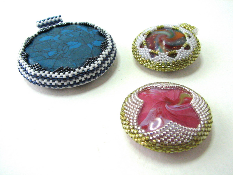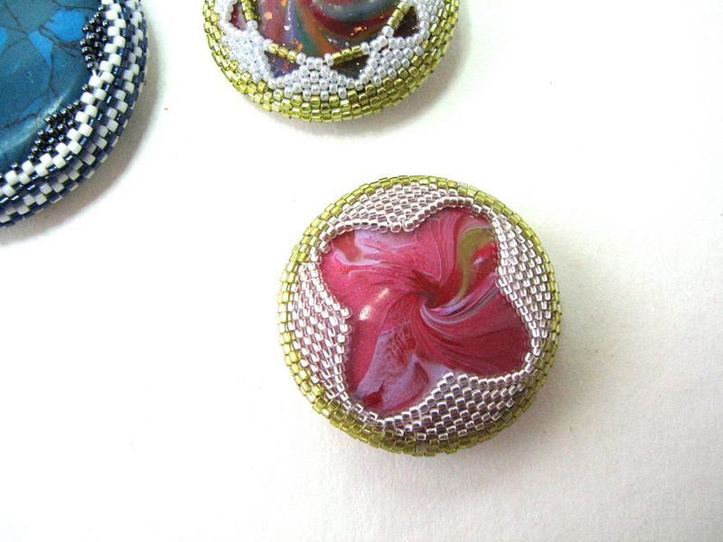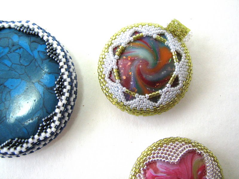 Las dos de la derecha son cuentas rotadas, cosidas con diminutas bolitas Miyuki alrededor.