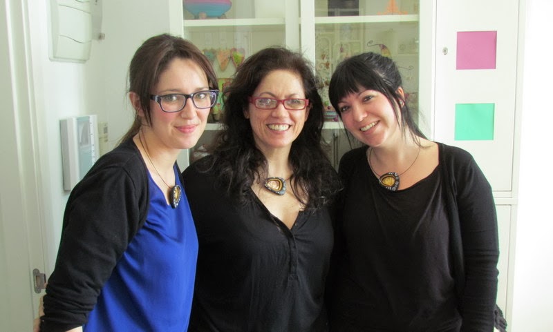 Con dos simpáticas personas que han venido de Toledo y tenían que marcharse (la estaban esperando :-)) Llevan puestos los colgantes que realizaron en el curso.