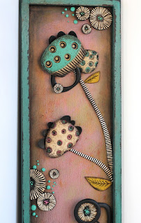 Todo está hecho de arcilla polimérica, excepto el cuadro que es de madera, construido y pintado a mano. Me encanta los suaves colores lleno de armonía que combinan bien con el negro, además de usar diferentes texturas y formas imperfectas, que en todo su conjunto expresan un equilibrio melancólico lleno de dulzura.