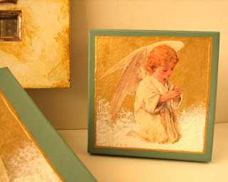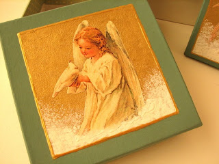 Los angelitos son figuras recortadas y pegadas, posteriormente he pintado a sus pies, con esponja, una imitación de nubes