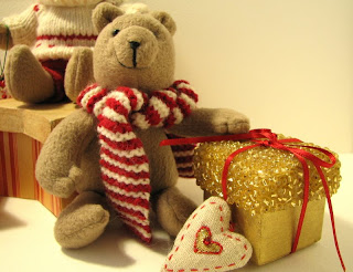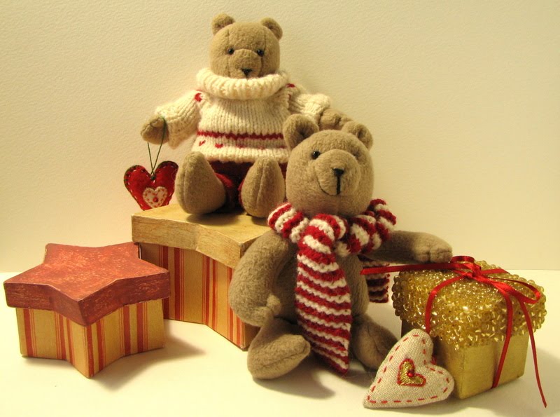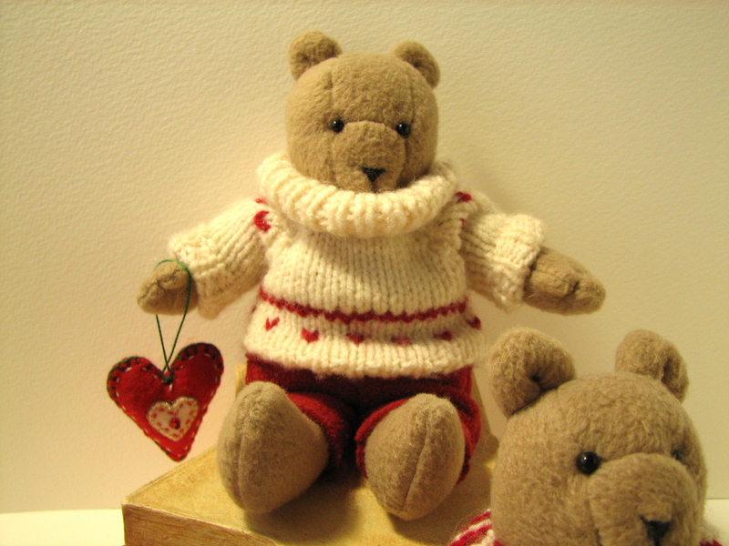 Ositos de tela cosidos, llevan jersey y bufanda hechos con aguja de punto.