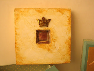 El cuadro del fondo, antes era uno corriente, yo lo he modificado poniendo un espejito en el centro y con una espátula he untado gesso. Posteriormente pintura acrílica de color.
