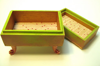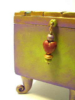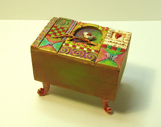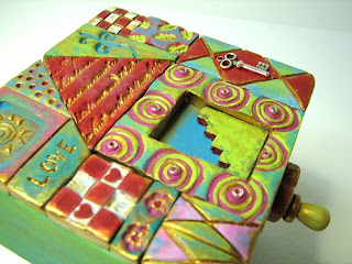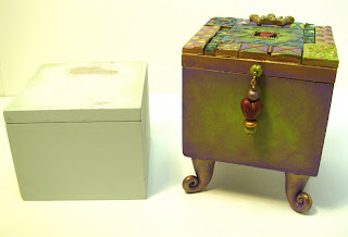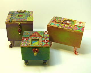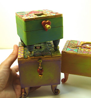 Comenzando a partir de unas simples cajas de madera he colocado con arcilla polimérica las patas, tiradores y tapas de mosaico. Cubierto con pintura técnica mixta.