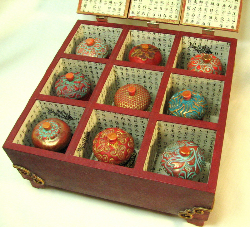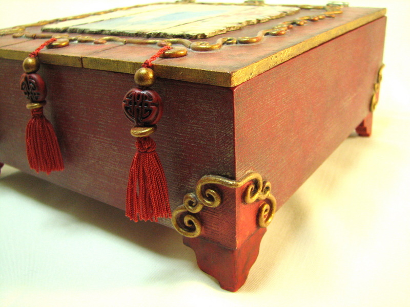 Caja costurera, medidas 22 x 22 cm, de madera y arcilla polimérica, estilo oriental.