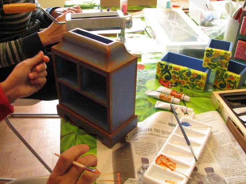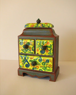 Una preciosa cajonera de madera, decorada con molduras de madera y los frentes como la parte superior hechos de arcilla con la técnica de imitación cerámica.