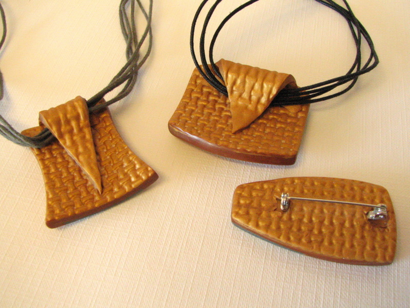 Dos colgantes y un broche de arcilla polimérica, hechos con la técnica Mica Shift.
